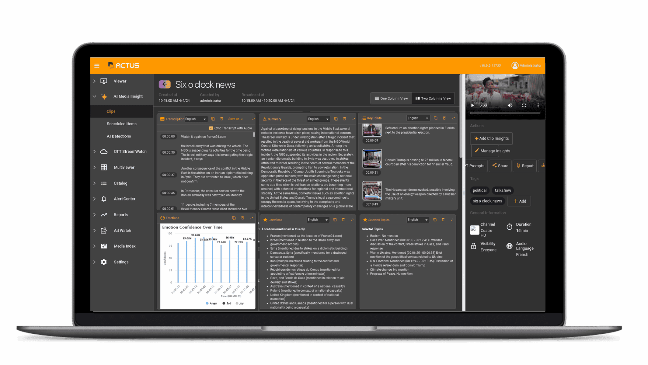 Whether you use Actus AI Media Insight as a standalone solution or as part of the Actus compliance logging and intelligent monitoring platform, it offers the only way to monitor a large volume of content quickly and effectively. With Actus, you can stay on top of all the relevant news as it happens. Whether you need to create updated news reports or stories, respond immediately to ongoing events, export clips to your social media platforms, OTT, Web, or automatically generate metadata for archiving purposes, Actus turns the content into a valuable asset for later use. Moreover, customizable filters allow you to receive only the news that is relevant to you, saving time and allowing you to focus on the stories that matter the most.
